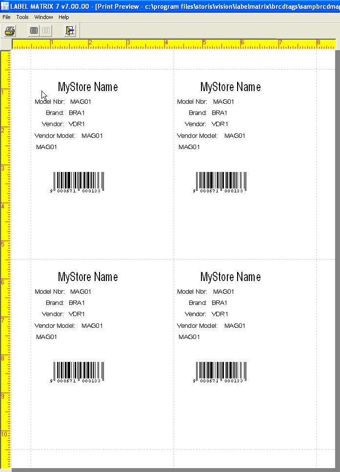Figure 2 shows the sample template SAMPBRC.QDF renamed to SAMPBRCMAG.QDF and ready for editing on the main editing screen in Label Matrix. The yellow rulers on the top and left side of the palette indicate the current size of the label template. Above the horizontal ruler is a row of buttons, the function of each you can determine by hovering your mouse over the button. To the left of the vertical ruler is a column of buttons containing various editing functions such as Add Text, Add Picture, and Add Bar Code.