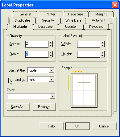 Our sample label is not very big. It takes up less than a quarter of the 8.5” by 11” template. Label Matrix provides a convenient feature where you can divide the template into portions. If you click on the File pull-down menu and select Page Setup, you access the Label Properties screen as shown in Figure 5. If you click on the Multiple tab, then adjust the Quantity field for both the Across amount and Down amount, you can divide your large template into smaller sections. The example above shows four sections. This template now prints four identical labels on one 8.5 x 11 sheet. Note that you can edit only one of the palettes, and the edits you make affect all palettes. Figure 6 shows the Print Preview screen after the template was divided in to four parts.