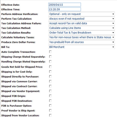Business Rules need to be set up on the CCH system as follows. Other than the Effective Date and Time shown here, these are the values you should enter in CCH in order to use the STORIS Alternate Tax Interface.