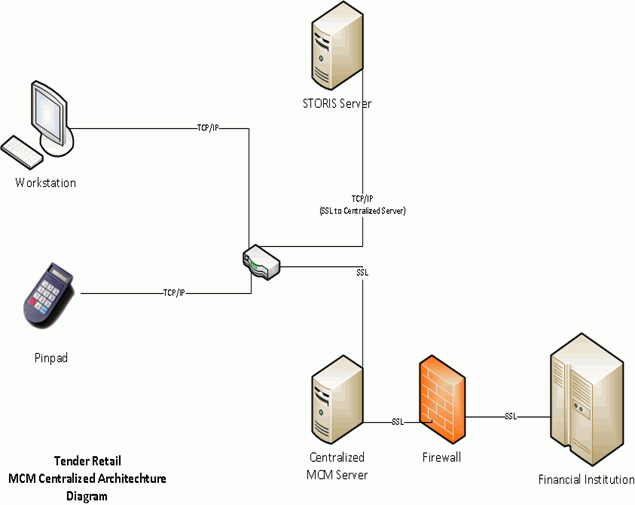 The following illustrates the Tender Retail MCM Centralized Architecture. It works by placing a server on the network that controls each pin pad. The STORIS server then sends a message to the Tender Retail MCM Centralized Server that includes, as part of the message, an identifier for the specific pin pad that is to be affected by the message.