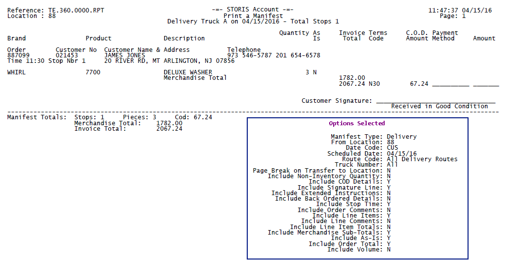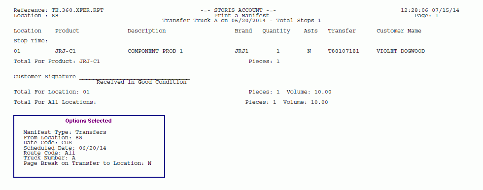 The Transfer by Product manifest only includes a customer's name if there is a sales order linked to the transfer. The name printed is obtained from the shipping information screen. The customer name column is blank if transfers are unlinked or are linked to other transfers.