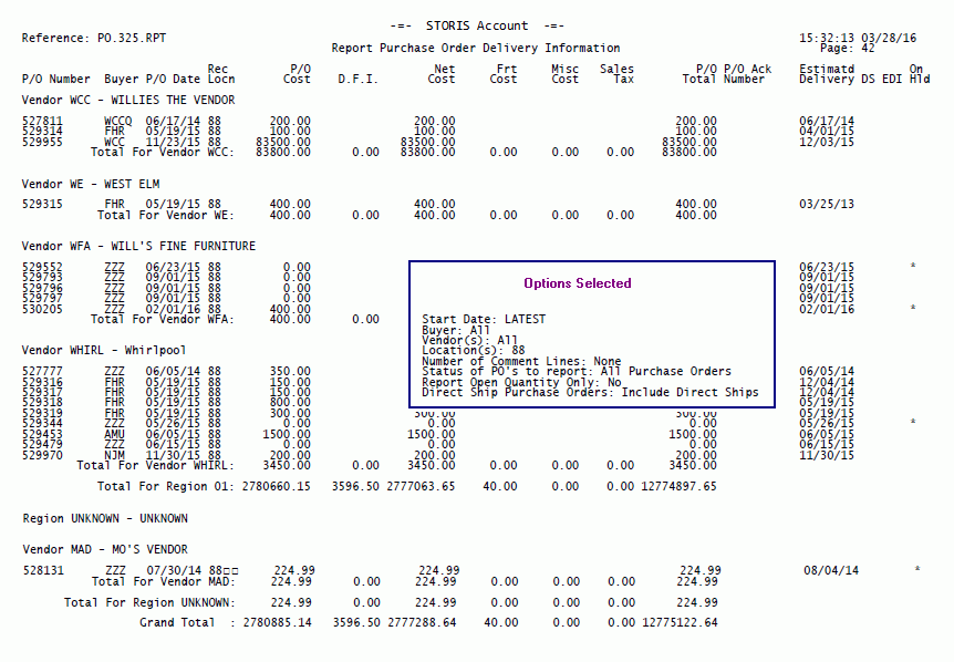 The options selected for this report are being displayed in the Options Selected box for illustrative purposes only.