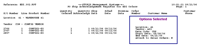 The Options Selected box below contains the selected run-time options for this sample, but does not appear in the actual report. The run-time options you select for each report appear on the last page of the report output.