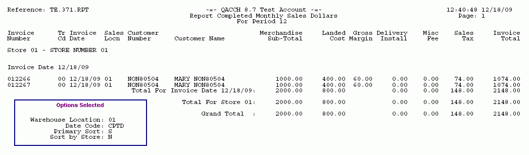 The run-time options selected for each report print on the last page of the report output. The options selected for this report display in the Options Selected box for illustrative purposes only.
