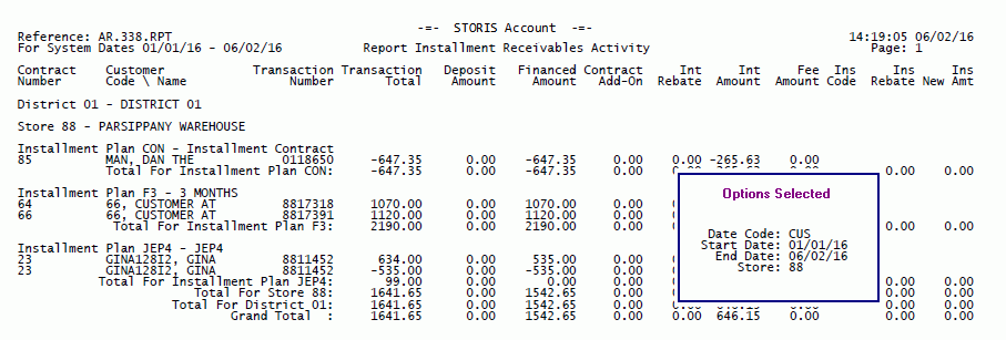 The Options Selected box below displays the selected run-time options for this sample, but does not appear when you run the actual report. The run-time options you select for each report appear on the last page of your report output.