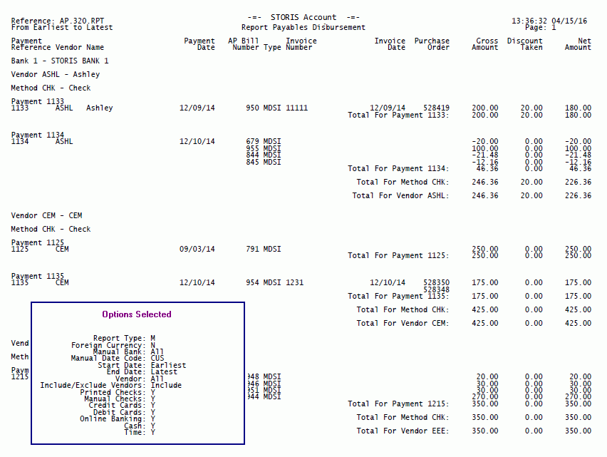 The Options Selected box below displays the selected run-time options for this sample, but does not appear when you run the actual report. The run-time options you select for each report appear on the last page of your report output. To return to the original report topic, click the Back button above.
