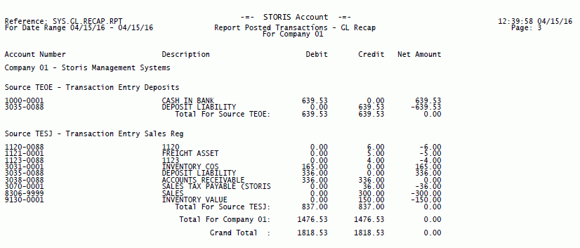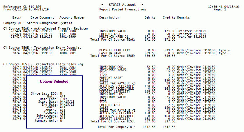 The Options Selected box below contains the selected run-time options for this sample, but does not appear in the actual report. The run-time options you select for each report appear on the last page of the report output.