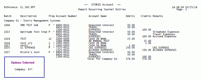 The Options Selected box below contains the selected run-time options for this sample, but does not appear in the actual report. The run-time options you select for each report appear on the last page of the report output. A grand total displays at the end of the report.