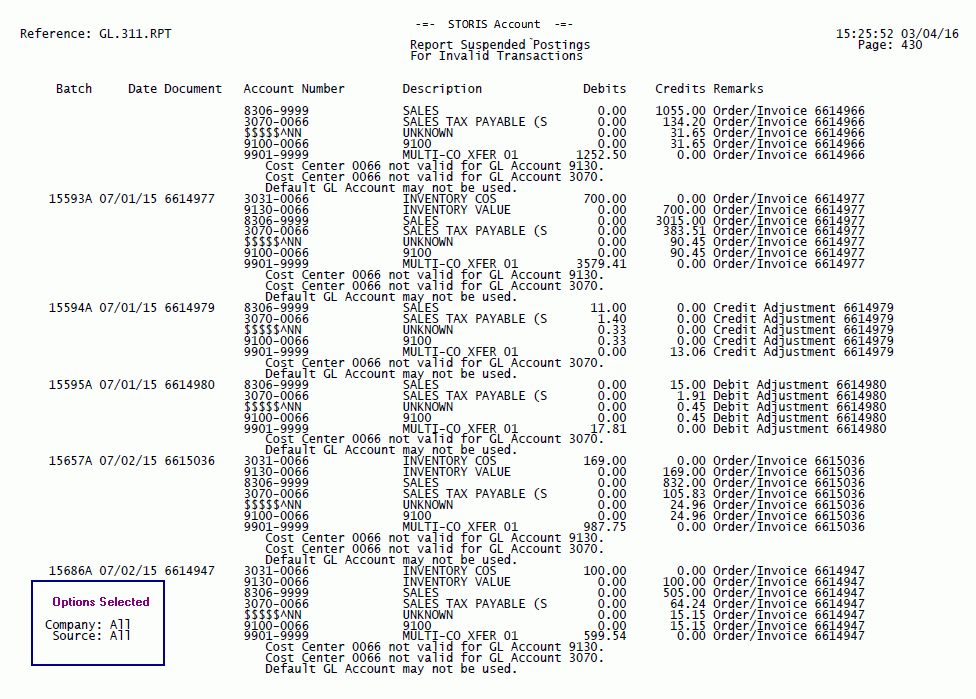 The Options Selected box below contains the selected run-time options for this sample, but does not appear in the actual report. The run-time options you select for each report appear on the last page of the report output. Grand totals also appear at the end of the report. To return to the original report topic, click the Back button above.