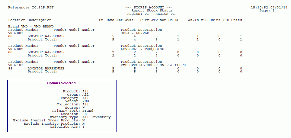The run-time options selected for each report print on the last page of the report output. The options selected for this report display in the Options Selected box for illustrative purposes only.
