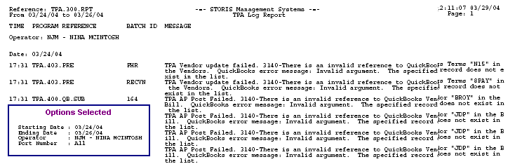 The run-time options selected for each report will print on the last page of the report output. The options selected for this report are being displayed in the Options Selected box for illustrative purposes only.