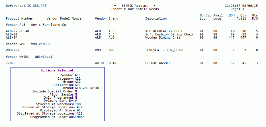 The run-time options selected for each report print on the last page of the report output. The options selected for this report display in the Options Selected box for illustrative purposes only.