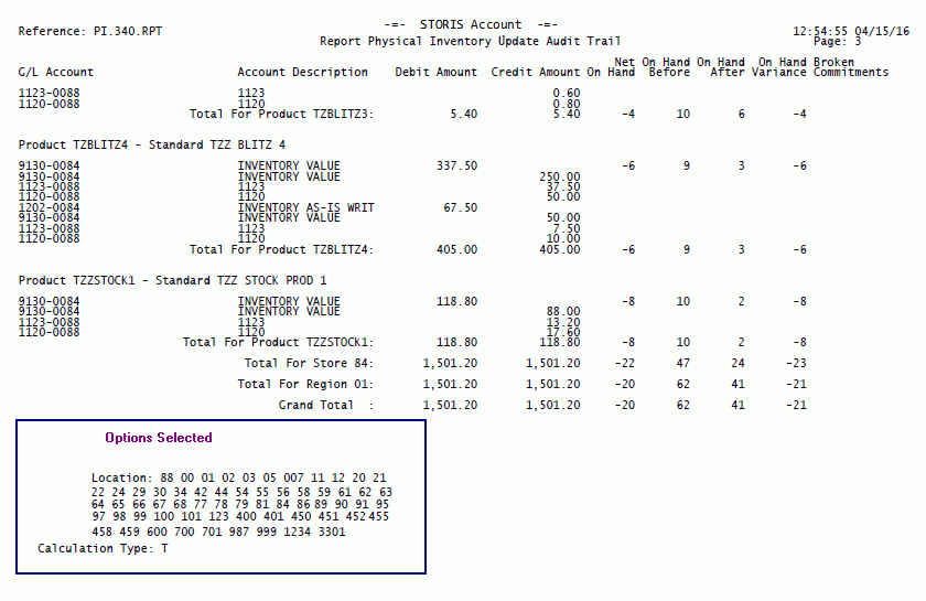 The run-time options selected for each report print on the last page of the report output. The options selected for this report display in the Options Selected box for illustrative purposes only.