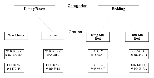 The following illustrates specific examples of the category/group/product relationship in the inventory hierarchy.