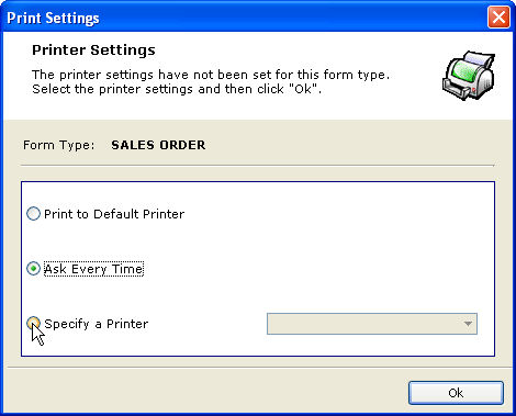 The Print Settings screen also appears the first time a user attempts to print a form type within STORIS. For example, assume you are printing a sales order document from the Enter a Sales Order routine and the system prompts "Would you like a printed copy of this order?". If the form type has never been printed, the Print Settings window displays as shown above, and you must specify a print destination for the form type.