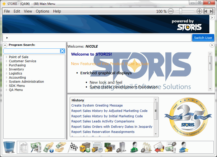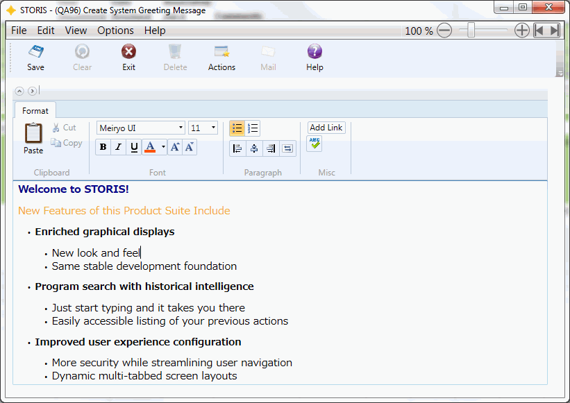 Use this routine to maintain the log-on greeting that appears on the Main Menu screen. Your greeting is a message your employees see when they log-on to this STORIS account. For example, your greeting can include special sales event announcements or instructions to staff. The Welcome: User line appears at the top of the message area. You cannot edit or delete this line.