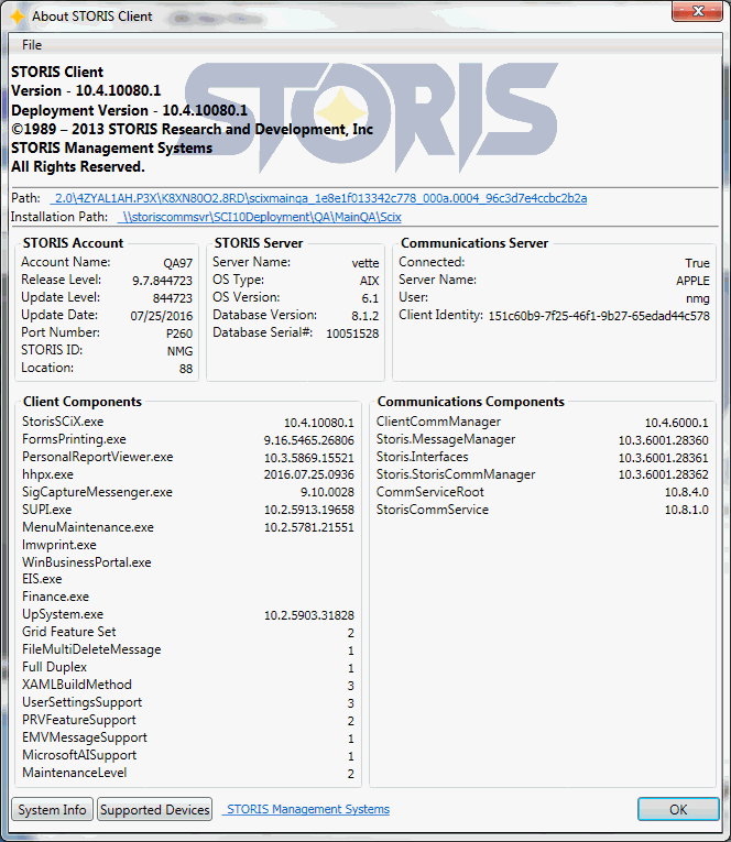 About - Select this option to view information about the STORIS Client you are running on your system. A window similar to the following displays.
