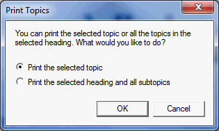 The Print Topics window shown here is available only when you have the Contents tab of the Help window open. Otherwise, when you click the Print button, the Print dialog window opens and you can print the current topic.