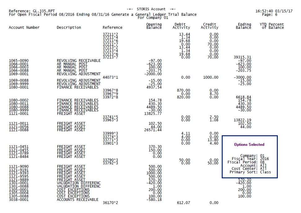 The Options Selected box below contains the selected run-time options for this sample, but does not appear in the actual report. The run-time options you select for each report appear on the last page of the report output.