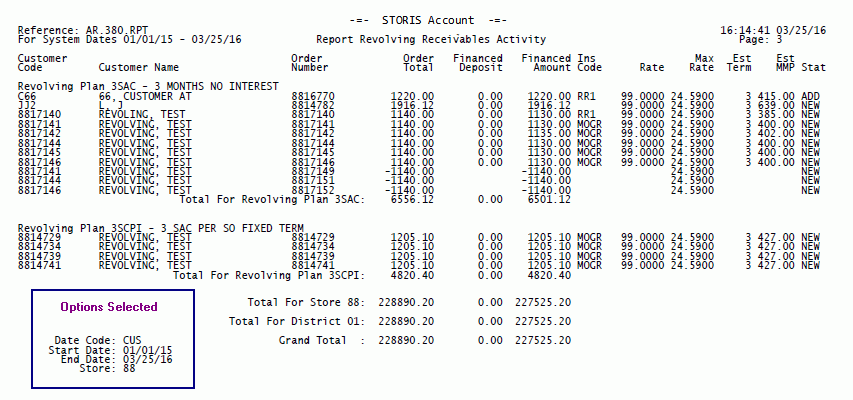 The Options Selected box below displays the selected run-time options for this sample, but does not appear when you run the actual report. The run-time options you select for each report appear on the last page of your report output.