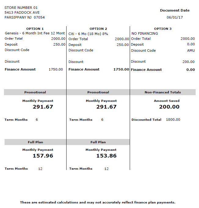 This sample illustrates the format of the document used when you print or email the Finance Payment Estimator information. To return to the original report topic, click on the browser's Back button above.
