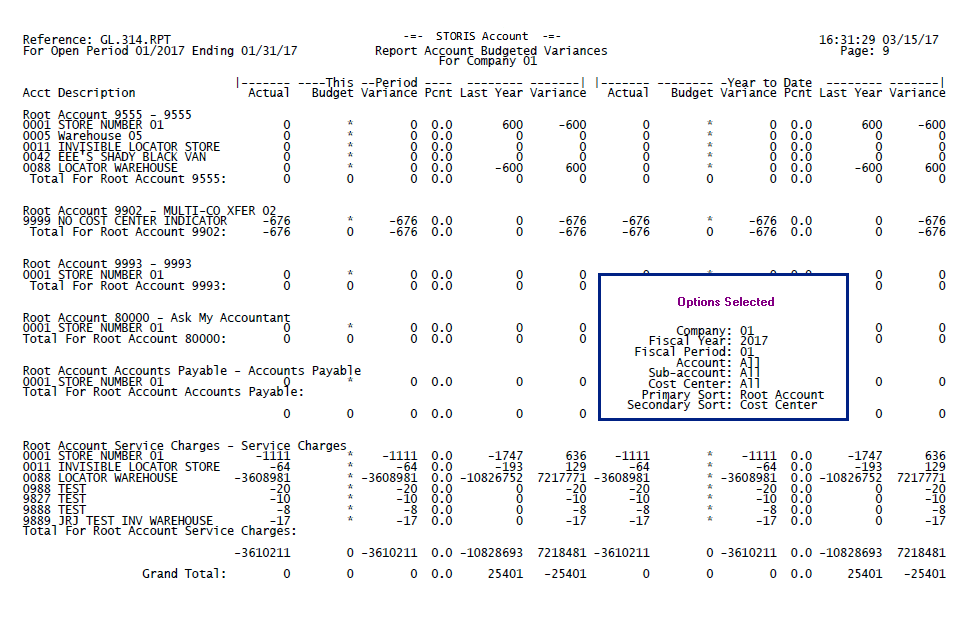 You can also run this report to compare variations for all accounts for one or more cost centers. Enter a primary sort of Cost Center with subtotal, a secondary sort of Root Account with subtotal, and a tertiary sort of Sub-Account.