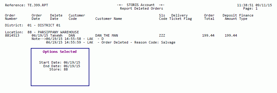 The Options Selected box below displays the selected run-time options for this sample, but does not appear when you run the actual report. The run-time options you select for each report appear on the last page of your report output.