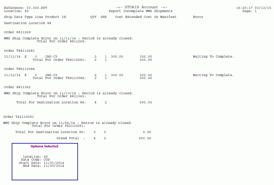 The Options Selected box below displays the selected run-time options for this sample, but does not appear when you run the actual report. The run-time options you select for each report appear on the last page of your report output.
