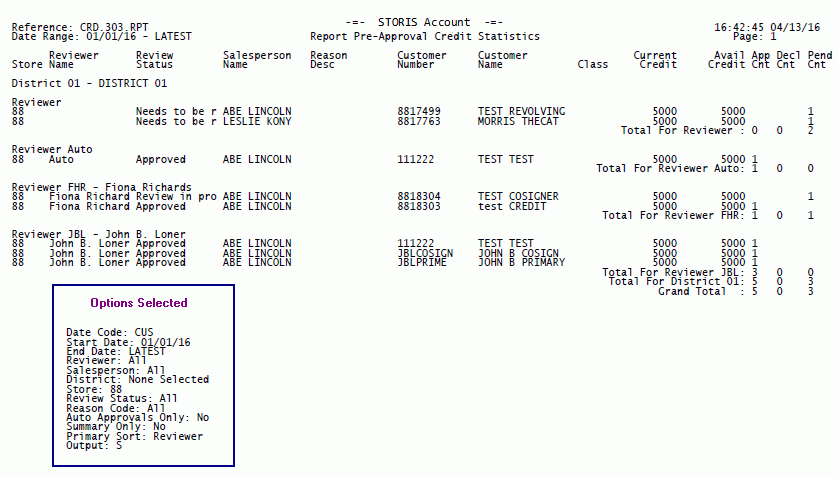 The Options Selected box below displays the selected run-time options for this sample, but does not appear when you run the actual report. The run-time options you select for each report appear on the last page of your report output.