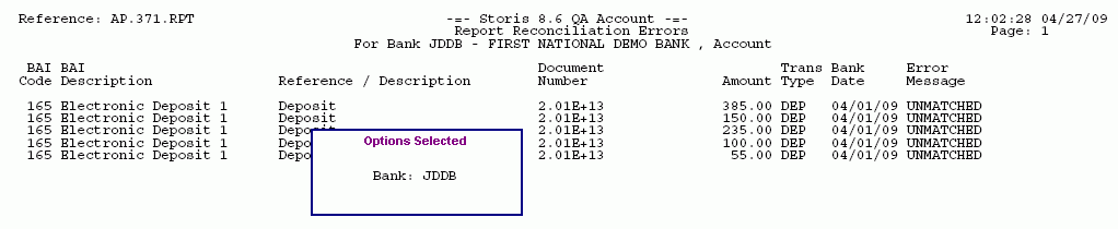 The Options Selected box below displays the selected run-time options for this sample, but does not appear when you run the actual report. The run-time options you select for each report appear on the last page of your report output. To return to the original report topic, click the Back button above.