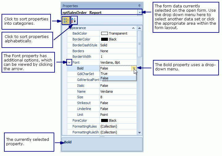 The Properties box (Figure 1) on the right side of the Form Management window houses the tools used to change the properties of form elements (bands and controls). Use the side scroll bar to view additional elements, which are divided into categories, such as Appearance and Behavior.