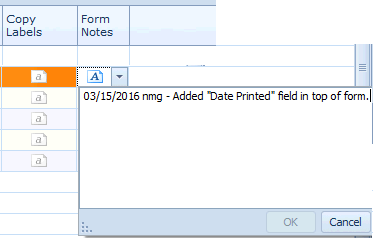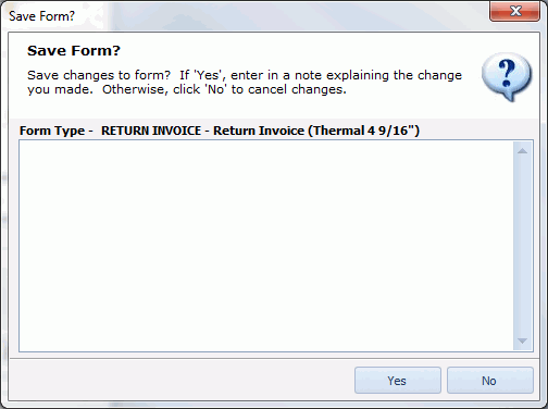 When saving changes, a description of the changes must be entered into the Save Form? text box. This description is known as Form Notes. After entering a description of the changes, click Yes.